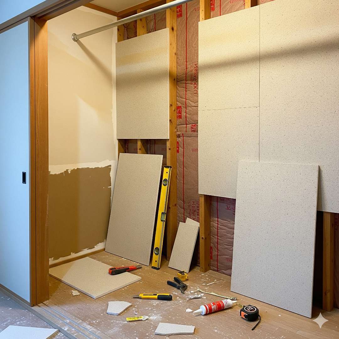 ・調湿建材の活用:特に、空気がこもりやすいクローゼットや押入れの内部には、湿気を吸ったり吐いたりして、空間の湿度を快適に保ってくれる「調湿建材」の活用がおすすめです。私たちLIXILリフォームショップ橋本建設がよくご提案するのが、LIXILの「エコカラットプラス」です。デザイン性も高く、壁に貼るだけで、結露を抑制し、カビやダニが繁殖しにくい湿度環境を保ちます。さらに、気になるカビ臭や生活臭を吸着してくれる脱臭効果も期待できる優れものです。