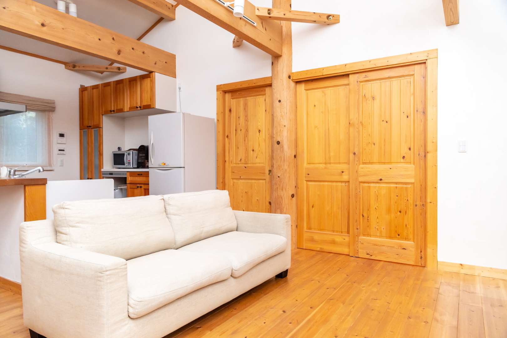 無機質になりがちな空間の中で、その筋交いが木造ならではの力強さと木の温もりを放つ空間のアクセントになっています。