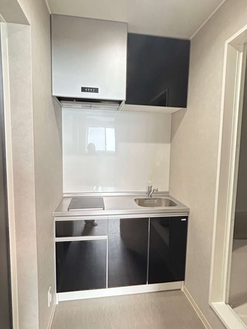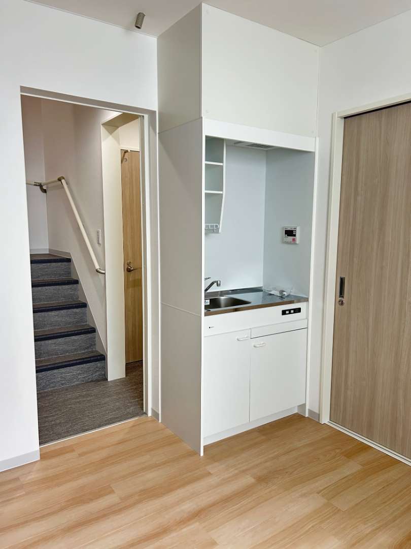 用途に合わせて使い分けられるよう、スタイリッシュなブラックパネルのミニキッチンと、階段横のデッドスペースを活かしたホワイトのミニキッチンの2箇所を設置。