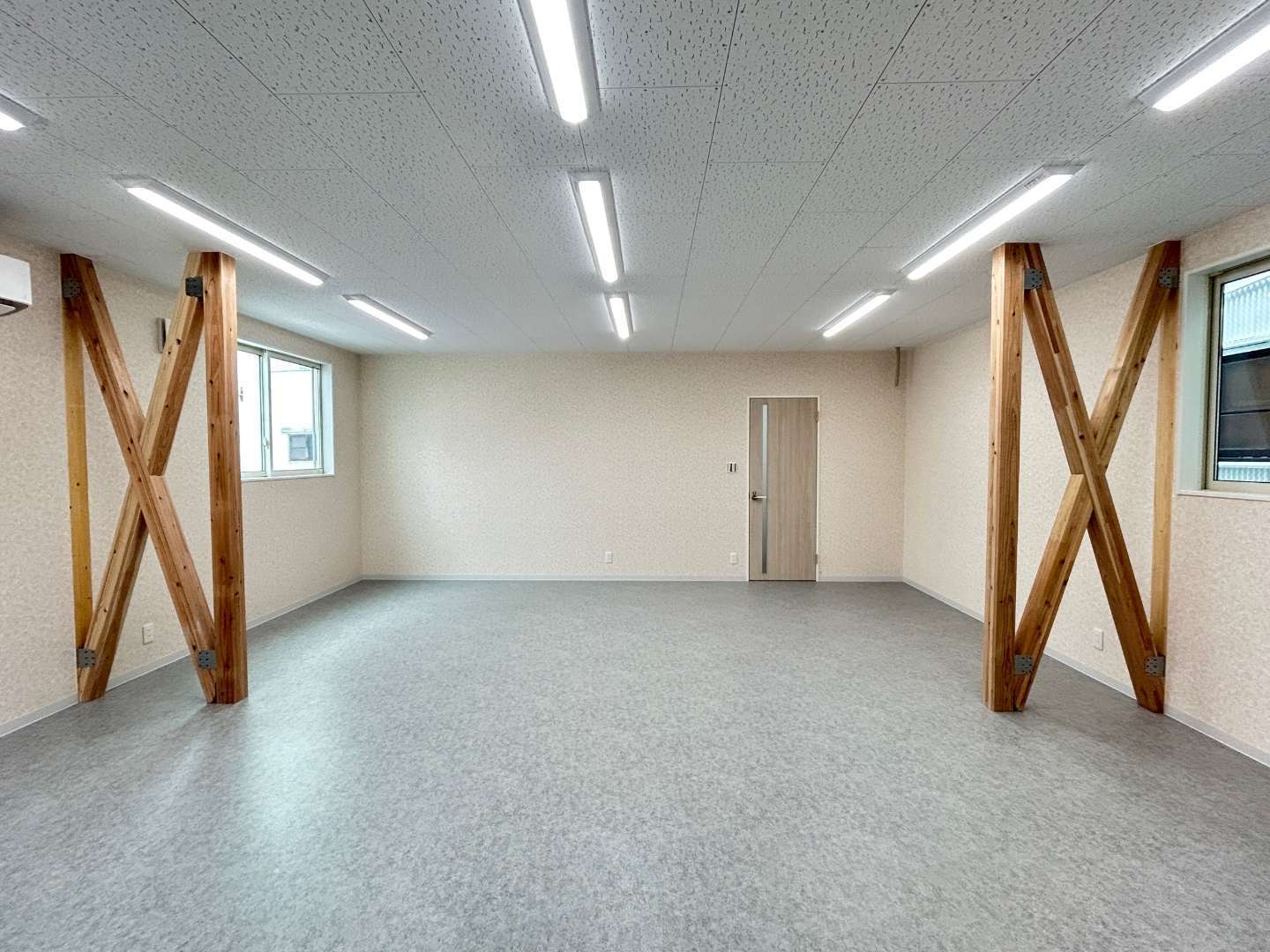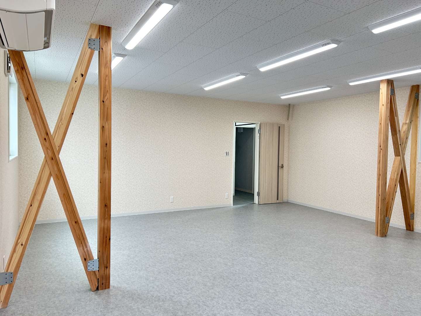 完成したメインのワークスペース(大空間)では、建物を支える「筋交い(X字の柱)」を壁で隠さず、あえて「あらわし」にして空間のアクセントにしています。無機質になりがちなオフィス空間に木の温もりが加わり、開放的でリラックスできる雰囲気に仕上がりました。