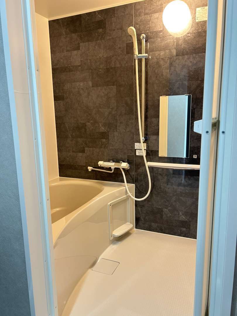 トイレは、グレーの石目調クロスを採用し、ホテルライクで落ち着いた空間に。さらに、夜間作業や泊まり込み、リフレッシュ用途などに対応できるよう、ゆったりと足を伸ばせるユニットバス(浴室)も完備しています。